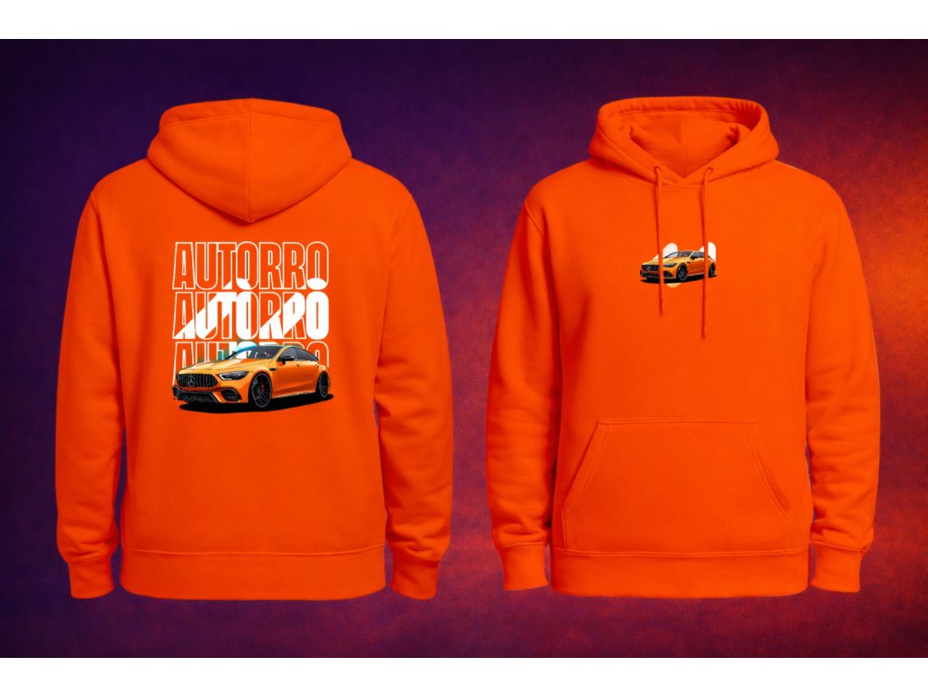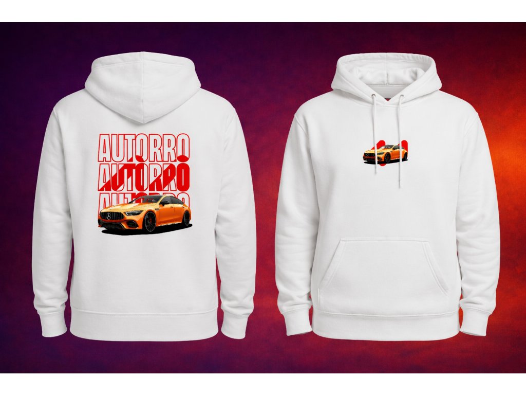 Mikina s Autorro logom, nápisom a Mercedesom AMG na chrbte a logom s Mercedesom AMG na prsiach. Dostupné v bielej a oranžovej farbe.